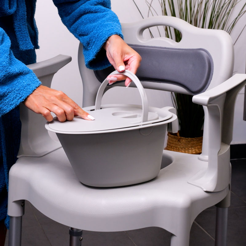 Elevador de WC con reposabrazos: retirando la cubeta puede colocarse directamente sobre el inodoro, proporcionando elevación adicional y apoyo lateral.